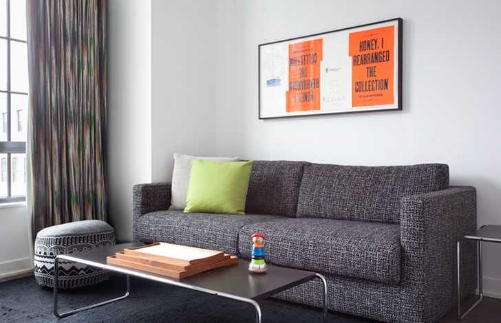 Unless you’re adventurous, we recommend sticking with neutral solid colors for large items like sofas and all four walls; bring in brighter hues via decorative pieces like smaller chairs, pillows, art, or one feature wall.